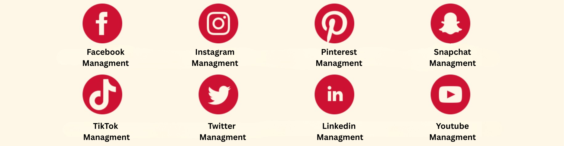 We manage Facebook, Instagram, LinkedIn, Pinterest, and YouTube professionally. Snapchat, TikTok, and Twitter are mostly personal-use platforms, so we don’t offer standard management for them.